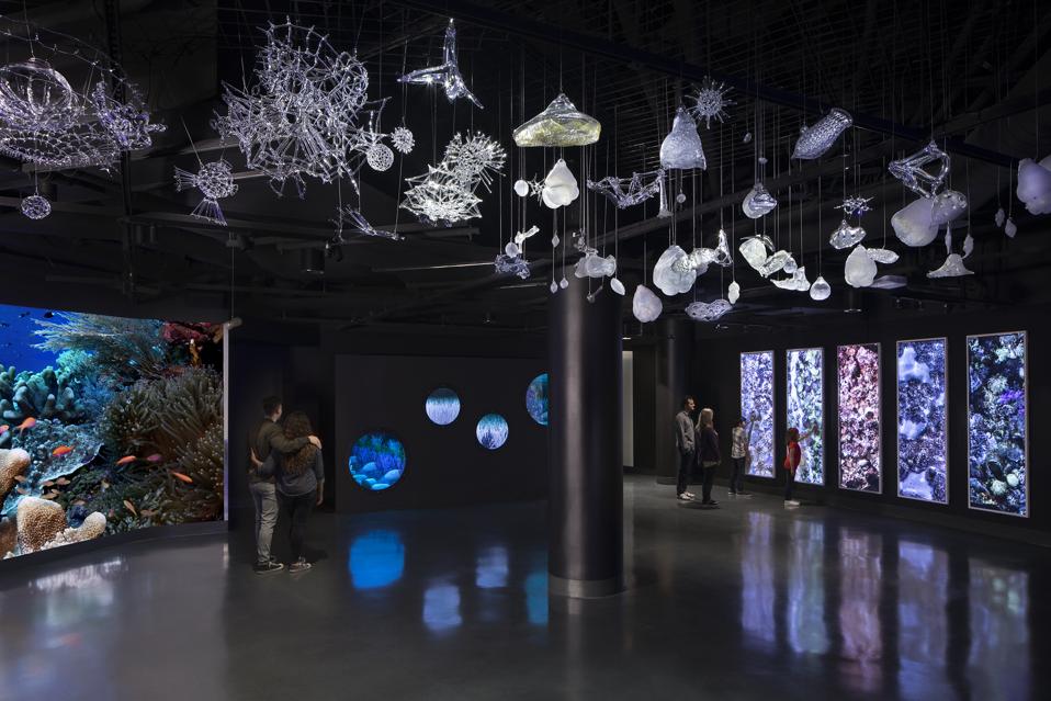 a Sua mais recente exposição, porém, destaca cada vez mais, um importante pedaço da história: de conservação., Visões do Pacífico abertas em maio de 2019, e apresenta a idéia de proteger o futuro do oceano através de exposições multisensoriais inovadoras, projetadas não apenas para entreter e educar, mas para fornecer essas oportunidades para as pessoas com deficiências visuais e auditivas, também, através de coisas como uma cachoeira visual interativa e uma parede de escultura de coral touchable. Esculturas de vidro de plâncton Penduradas no teto na seção de Galeria de arte, levando o caminho para o teatro imersivo, que mostra um filme sobre conservação em uma tela curva de 180 graus que inclui o vento e efeitos de nevoeiro no show.,